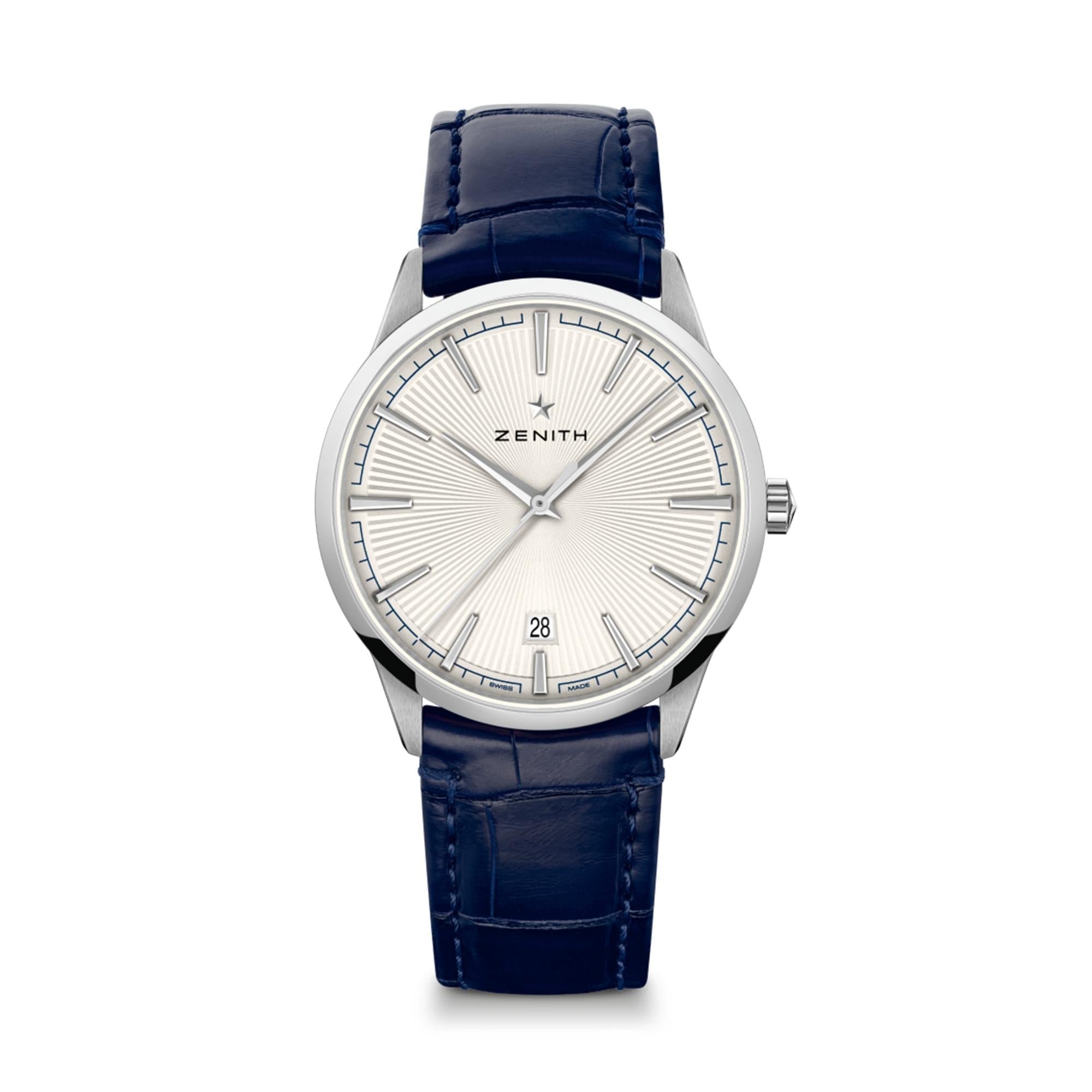 Reference: 03.3100.670/01.C922Calibre: Elite 670 automatic Power Reserve: 50 Hours Frequency: 28,800 VpH (4 Hz) Dial: Silver dial Band: Blue alligator strap Clasp: TangGender: UnisexWidth: 40.5mmColor: SilverMaterial: Steel